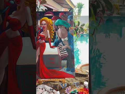 This painting captures the vibrant, surreal energy of a jazz-filled night. The central figure, a bold femme fatale in red, commands attention with her sultry pose and microphone, symbolising the allure of performance. Surrounding her, a cast of eclectic characters—musicians, the coolest Dude in the world The Boss, and shadowy onlookers—creates a captivating and dynamic interplay of sound, smoke, and emotion. Through bold colours and distorted perspectives, I aim to explore the chaotic beauty of nightlife, inviting viewers into a dreamlike world where reality and imagination collide.