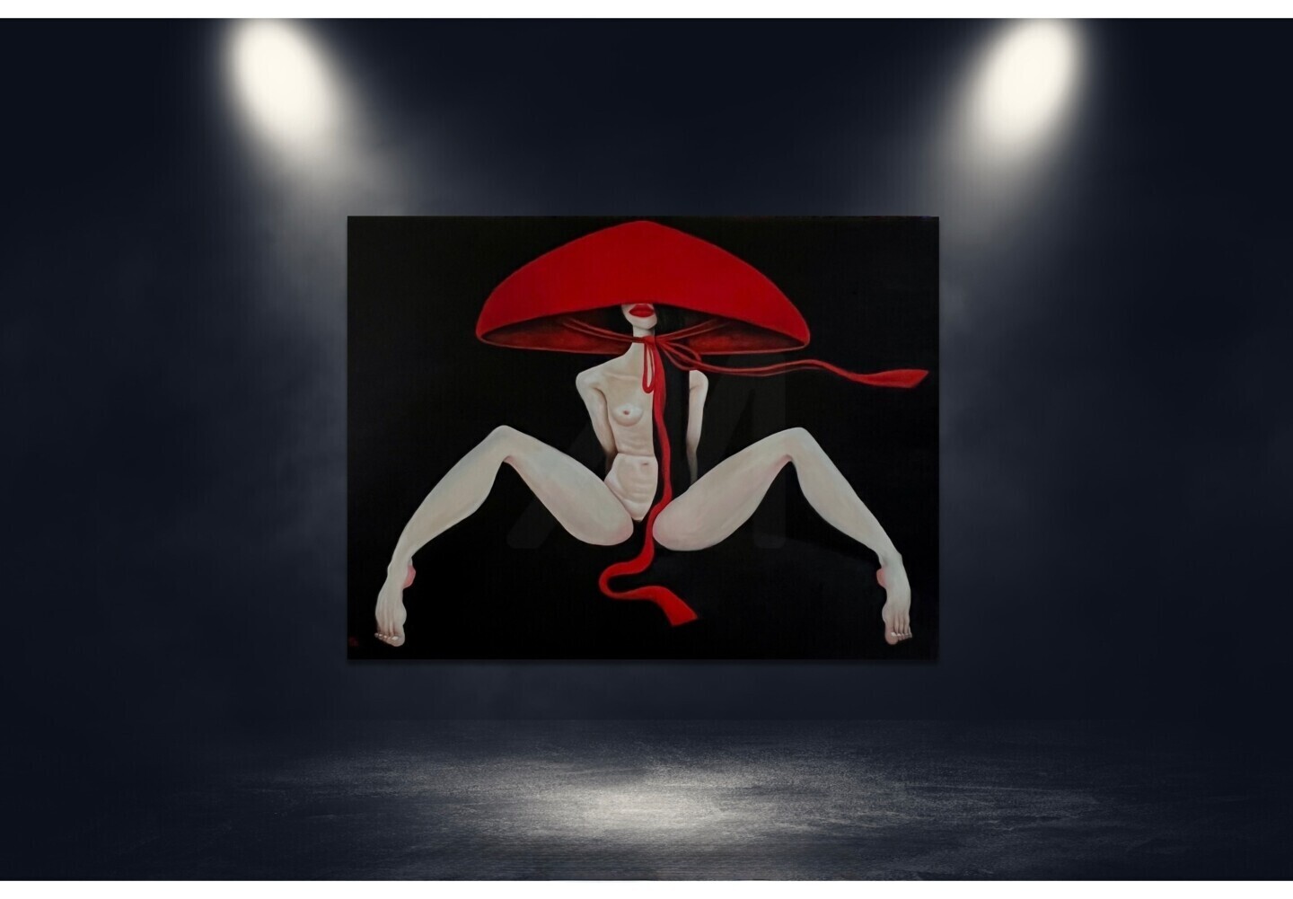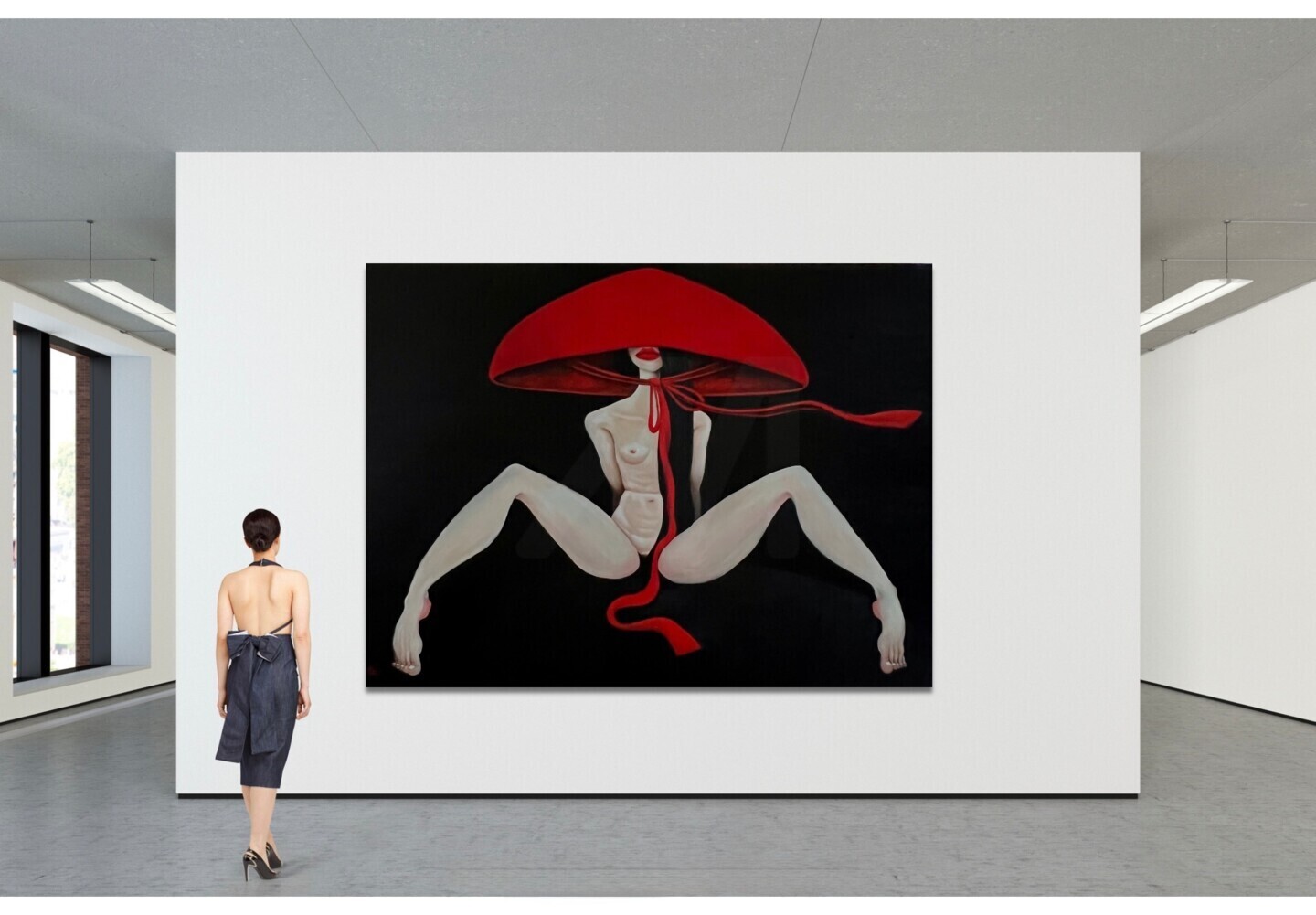 The use of oil paints brings a richness and depth to the canvas, enhancing the textures and colors. The striking red hat creates a focal point, drawing the viewer's eye and adding an element of intrigue. The figurative composition and the artist's conceptual approach invite contemplation and personal interpretation.